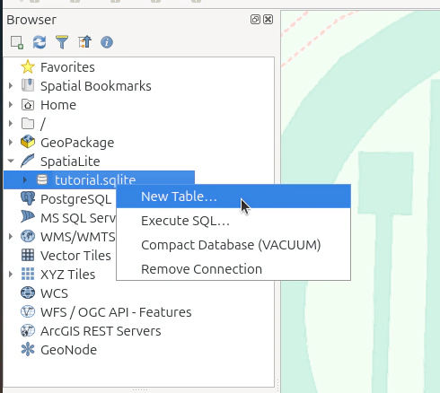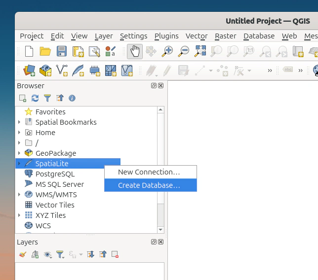 In the left side bar, right-click “SpatiaLite” and select “Create Database…”